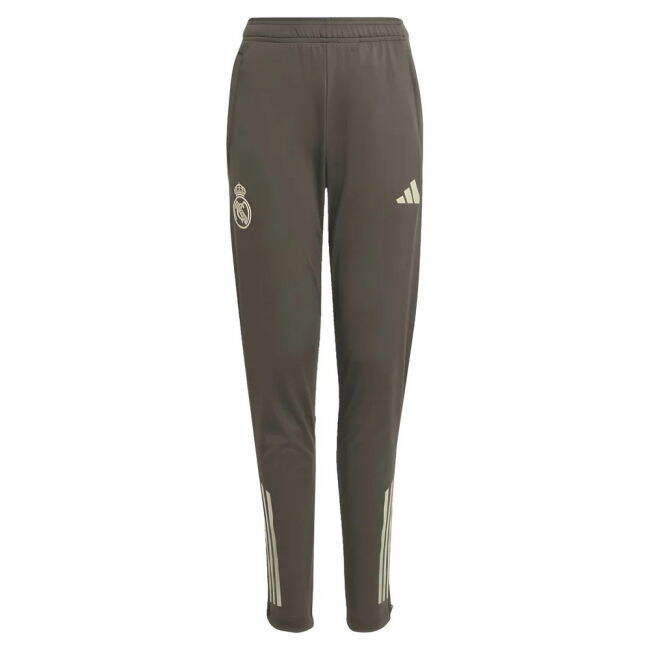 Stylish adidas Performance tracksuit, consisting of a yellow cardigan and a pair of grey-brown track pants. The Tracksuits has the adidas logo and stripes in contrasting colors as well as a Real Madrid logo on the left chest and right thigh.